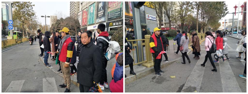 在前期和驻凤城二路的交警支队商议后,志愿者们赶往凤城二路路口,进行“文明出行,构筑和谐”志愿服务。到达目的地后,交警同志为志愿者们配发了小黄帽、臂章和红旗,并给大家进行了简单培训。之后,志愿者有序分为若干小组,开始在各个路口的人行道旁协助交警维护道路通行安全。活动过程中,志愿者们主要负责红绿灯过马路的秩序维护,阻止行人闯红灯,维护交通秩序。队员们在服务过程中,通过交警的指导,逐渐适应。期间,不时有行人向志愿者问路求助,队员们耐心解答,不清楚也会帮路人导航,得到了行人的一致感谢。大家克服天气的严寒,用极强的责任心不松懈不偷懒,认真指挥斑马线上的行人通行,充分体现出了志愿者精神。