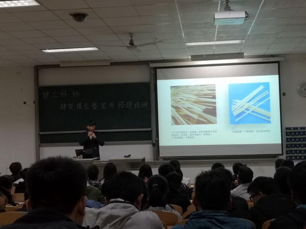 首先,唐继鹏介绍模型制作所需要的材料,例如胶水,亚克力板,染料等。并详细讲解了各个材料的用途和注意事项,他特别强调了不同胶水在不同材料上形成的不同效果,并认真的叮嘱新生在以后的模型制作中认真对待。然后,权毅博展示了许多室外搭建的优秀作品,并带领大家领略了建筑的奥妙,在场的每一个人都被那奇妙的建筑深深震撼。最后,赵灿介绍了建工学院的建筑文化周的传统活动及本学期的时间安排,希望大家在为本次活动做好规划并在模型制作中取得佳绩。