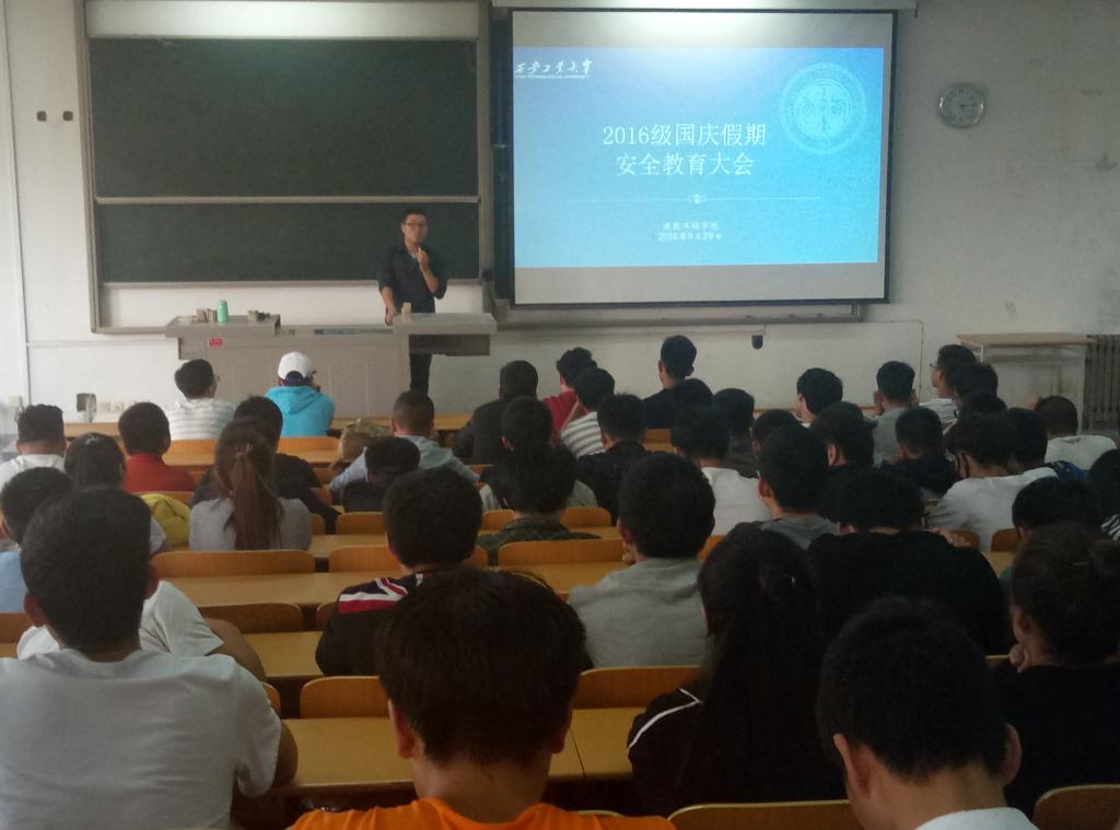 2018年9月27日,2016级辅导员安春雨在教一101教室对员工进行了国庆假期的安全教育。