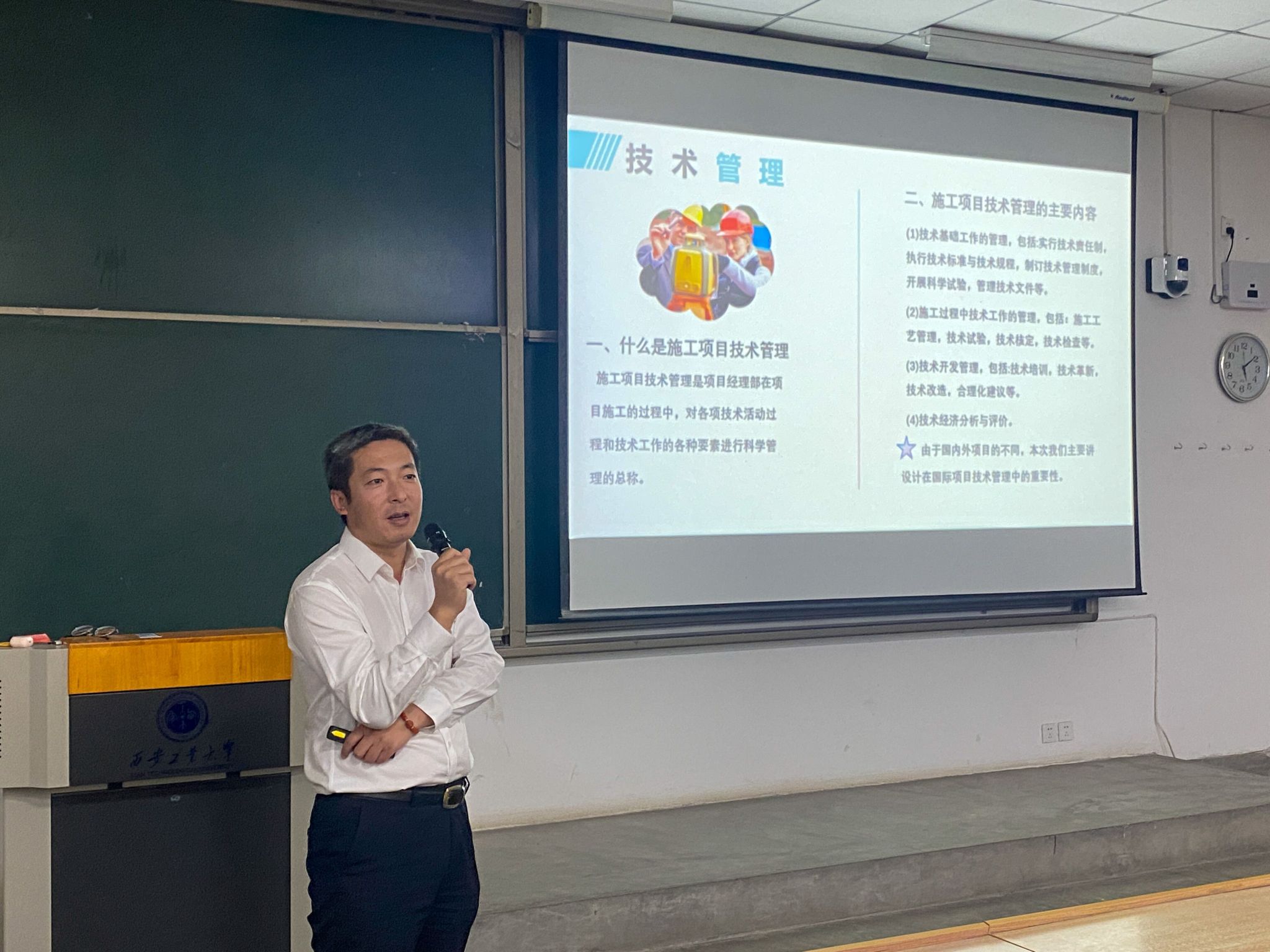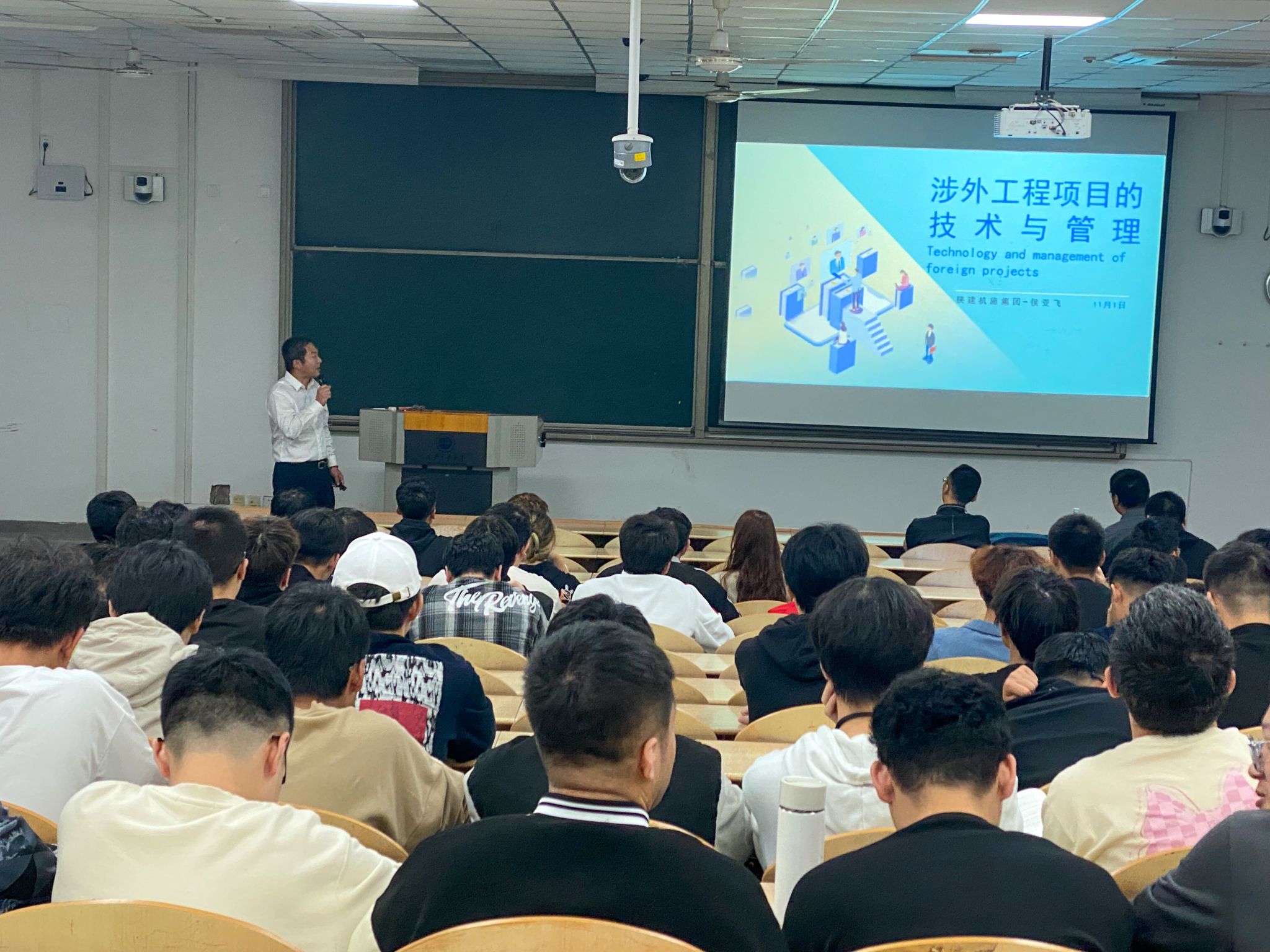 接下来,员工侯亚飞向与会师生作了题为“涉外工程项目的技术与管理”的分享。他结合自己的求学经历和工作经验,从项目概述、技术管理、合同管理、施工管理、人员管理五个方面进行讲解。其中,对技术管理与合同管理做了重点阐述。在技术管理方面,侯亚飞详细讲述了海外工程项目的流程,强调了设计在施工中的重要性,海外项目不能如国内的施工项目一样,先全部完成设计图纸阶段再进入到施工阶段,而需要采用设计、施工同时进行的方式。项目需要首先进行项目设计,然后进行设计报批,只有获得批准的图纸才能作为施工图纸最终用于施工。